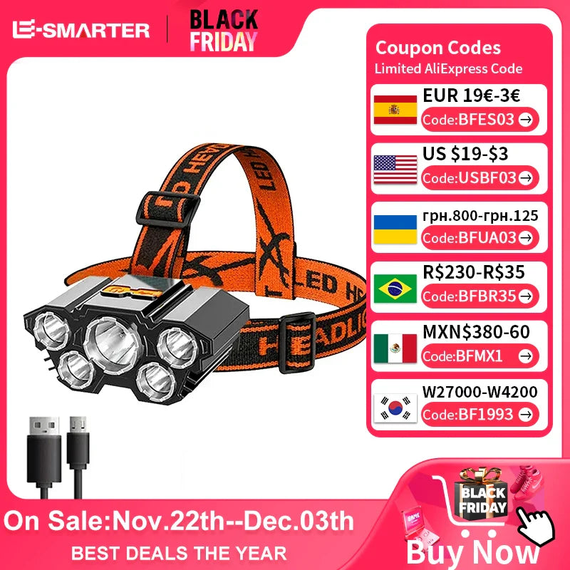 Latarka czołowa LED 5 diod, ładowalna, mocne światło